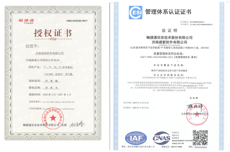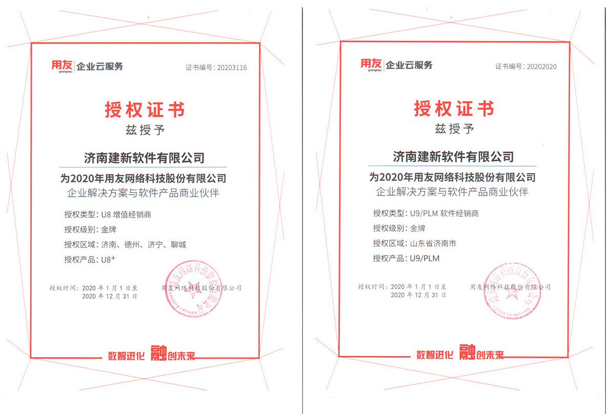2020年,用友授予山東建新軟件有限公司為用友網(wǎng)絡(luò)科股份有限公司企業(yè)解決方案與軟件產(chǎn)品商業(yè)伙伴,授權(quán)產(chǎn)品包括用友U8+、U9、暢捷通、用友云等。